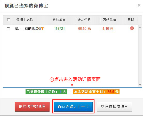 3、预览已选择微博主,确认活动;